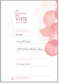 - Award Winner (6th of 84 entries in class) in French chamber of commerce Victorian wine show “Le Concours Des Vins Du Victoria 2006”